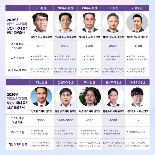 [편집자 주] 이코노믹데일리는 2026년 상반기 코스피 시장 전망을 위해 국내 주요 증권사 리서치 전문가들을 대상으로 설문조사를 실시했다. 전문가들은 코스피 최고 지수를 4500~5800p로 다양하게 전망했으며 기준금리와 환율 등 거시경제 지표에 대한 의견도 함께 제시했다.