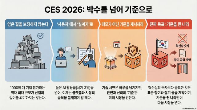 지금 한국이 CES에서 보여줘야 할 것은 기술 시연이 아니라 기준이다. AI가 산업 장비와 로보틱스, 모빌리티의 두뇌로 들어가는 국면에서 안전과 책임, 신뢰를 어떻게 설계할 것인지에 대한 답이 필요하다. 기술의 성능보다 중요한 것은 운영의 규칙이다. 데모는 하루를 남기지만, 기준은 시장을 남긴다.