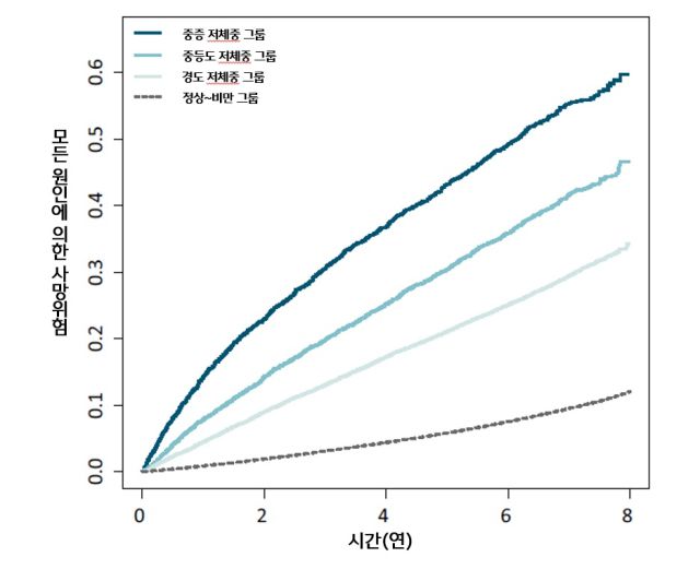 연구팀은 전체 조사 대상을 체질량 지수(BMI)를 기준으로 16.0㎏/㎡ 미만인 중증 저체중과 중등도 저체중(16.0~16.9㎏/㎡), 경도 저체중(17.0~18.4㎏/㎡), 정상(18.5~22.9㎏/㎡), 과체중(23.0~24.9㎏/㎡), 경도 비만(25.0~29.9㎏/㎡), 중등도 비만(30.0~34.9㎏/㎡), 고도 비만(35.0㎏/㎡ 이상)의 8개 그룹으로 나눠 모든 원인에 의한 사망률을 비교했다. 그 결과 흔히 ‘마른 당뇨’로 불리는 저체중 그룹의 사망 위험이 BMI 정상부터 고도 비만에 이르는 나머지 그룹에 비해 최대 3.8배 높았다. 사망 원인별로 봐도 저체중 그룹의 당뇨병, 심혈관질환, 뇌혈관질환에 의한 사망률이 1.9배에서 최대 5.1배 높은 것으로 나타났다.