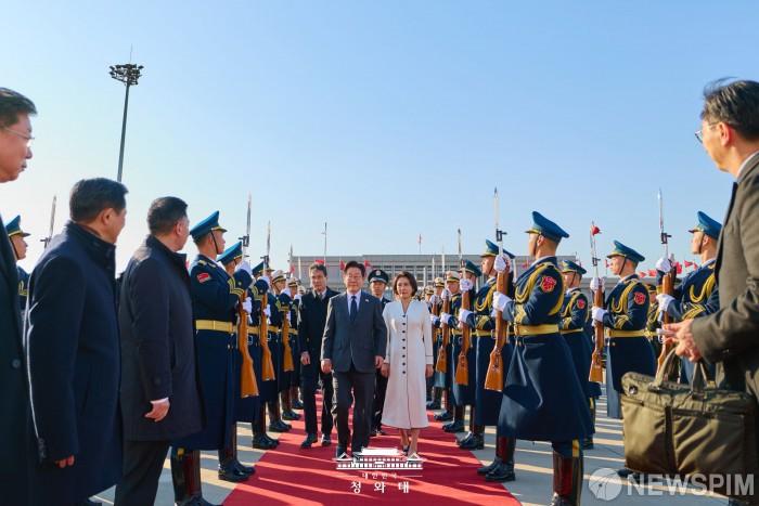 [서울=뉴스핌] 시진핑 중국 국가 주석과 정상회담을 마친 이재명 대통령이 지난 6일 오후 김혜경 여사와 함께 베이징 서우두공항에서 상하이로 출발하고 있다. [사진=청와대] 2026.01.07 photo@newspim.com |