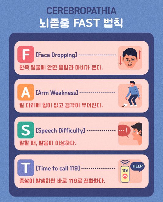 뇌졸중의 중중도를 평가하는 뇌졸중 척도(42점 만점)에서 '증상이 없는 경우'를 0점, 4점 이하를 '경증'으로 분류한다. 점수가 1점 증가할수록 3개월 후 정상적으로 복귀할 가능성은 10%씩 줄어든다. 일반적으로 뇌졸중의 전조증상은 Face(얼굴)·Arm(팔)·Speech(언어)·Time(시간)의 약자인 'F·A·S·T 법칙'으로 확인할 수 있다. 웃을 때 한쪽 얼굴만 움직이거나, 한쪽 팔에 힘이 안 들어가거나, 말이 어눌해지거나 발음이 부정확해지는 증상이 하나라도 나타날 경우 즉시 119에 신고해 병원을 찾아야 한다는 의미다.