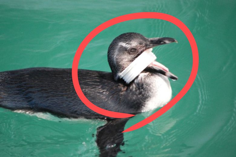헤엄치다 버려진 플라스틱 고리가 목에 걸린 새끼펭귄. 몸이 커질수록 더 깊게 살갗을 파고드는 탓에 생명까지 위태로운 상황이다.