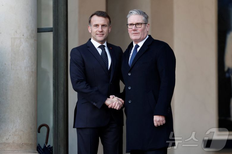 에마뉘엘 마크롱 프랑스 대통령과 키어 스타머 영국 총리가 6일 파리 엘리제궁에서 열릴 '의지의 연합' 정상회의에 앞서 악수를 나누며 기념 촬영을 하고 있다. 2026.1.6 ⓒ 로이터=뉴스1 ⓒ News1 강민경 기자 |