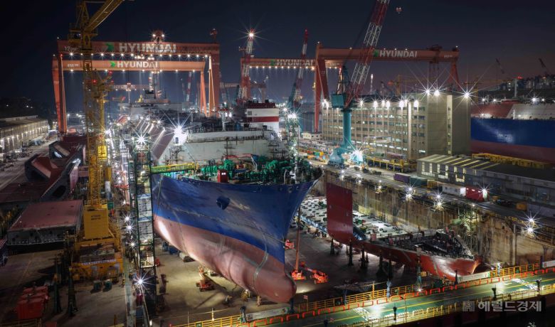지난해 12월 18일 저녁 울산광역시 HD현대중공업에는 영하의 한파 속에서 조선소 근로자들이 뿜어내는 열기가 가득한 모습. 울산=이상섭 기자 |