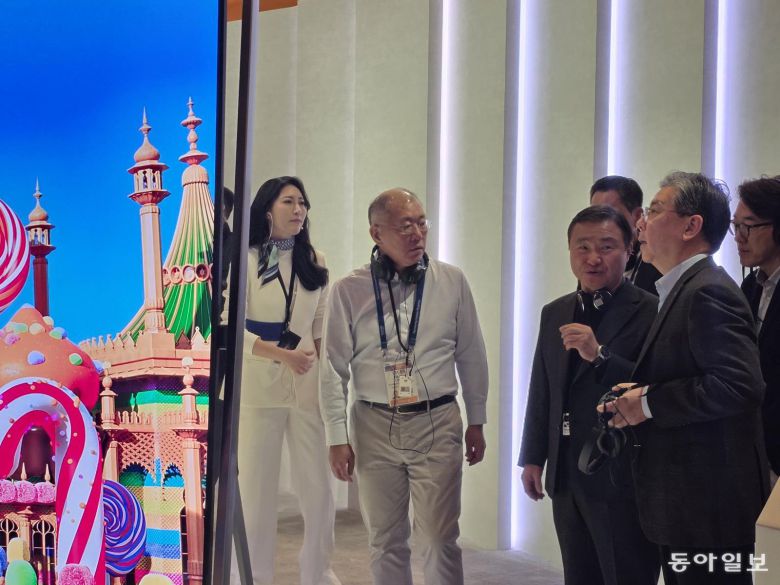 정 회장은 이날 무척 바쁜 스케줄을 소화했다. 오전 10시 전시관이 문을 열자마자 라스베이거스컨벤션센터(LVCC)에 차려진 두산그룹, 현대차, 퀄컴, LG전자 부스를 차례로 방문했다. 그는 두산 부스에서는 AI 기술을 적용한 소형 모듈 원자로(SMR)와 두산밥캣의 중장비 기술에 대한 설명을 들었다. 이후 퀄컴 부스에서 아카시 팔키왈라 퀄컴 최고운영책임자(COO)와 약 10분간 면담한 것으로전해졌다.