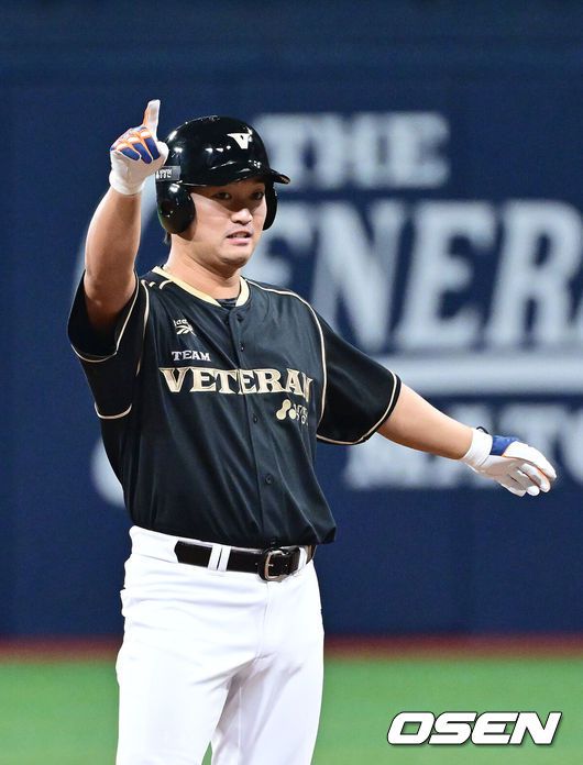 [OSEN=고척, 최규한 기자] 30일 오후 서울 고척스카이돔에서 '더 제너레이션 매치’가 열렸다. 이번 경기는 '세대를 잇는 한판 승부'를 콘셉트로 팀 베테랑에는 김현수, 양의지, 강민호, 임찬규, 박건우 등이 포진하며, 팀 라이징에는 원태인, 안현민, 이의리, 김영웅, 김택연 등이 출전한다. 6회말 고우석이 적시타를 날리고 2루에 안착해 기뻐하고 있다. 2025.11.30 / dreamer@osen.co.kr |