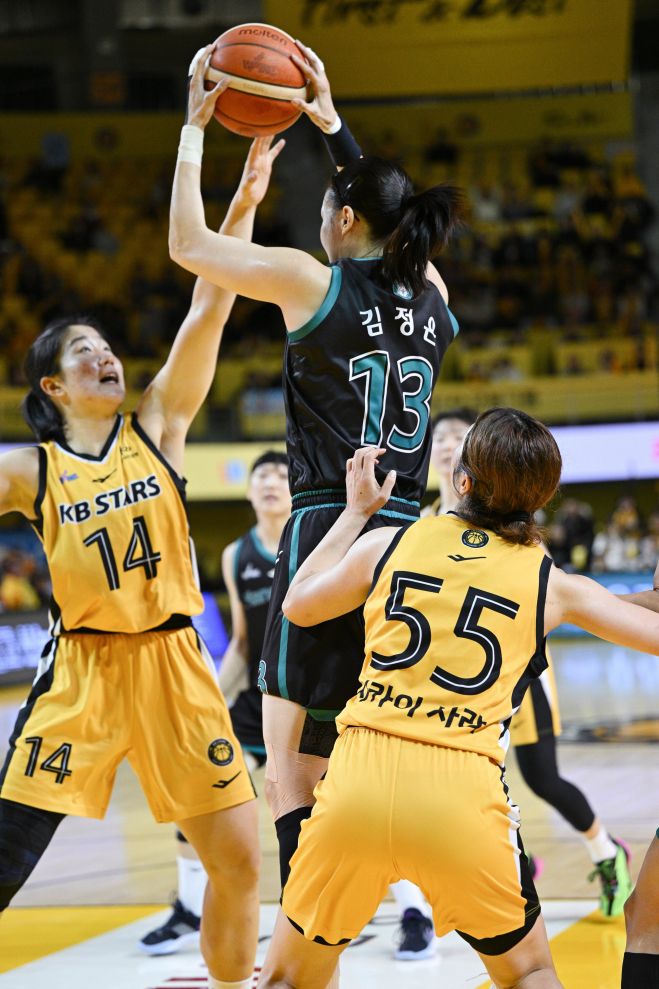 하나은행 김정은이 KB스타 선수들과 리바운드 다툼을 벌이고 있다. WKBL 제공 |