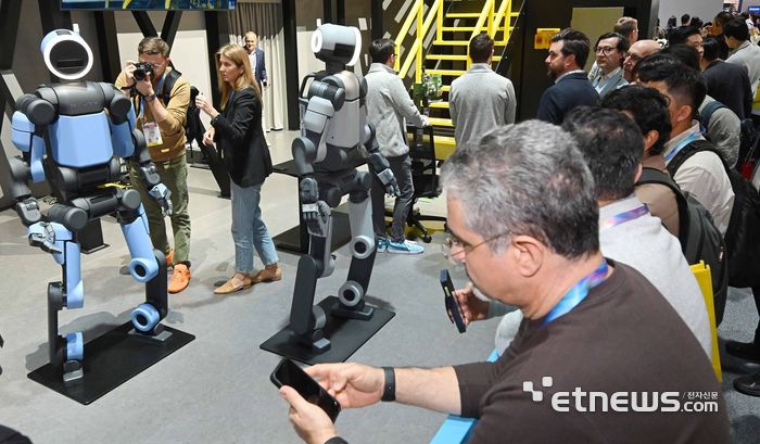 세계 최대 가전·정보기술(IT) 전시회 'CES 2026'이 개막한 6일(현지시간) 미국 네바다주 라스베이거스 LVCC 웨스트홀에 마련된 현대차그룹 부스에서 참관객이 차세대 전동식 휴머노이드 로봇 아틀라스를 살펴보고 있다.