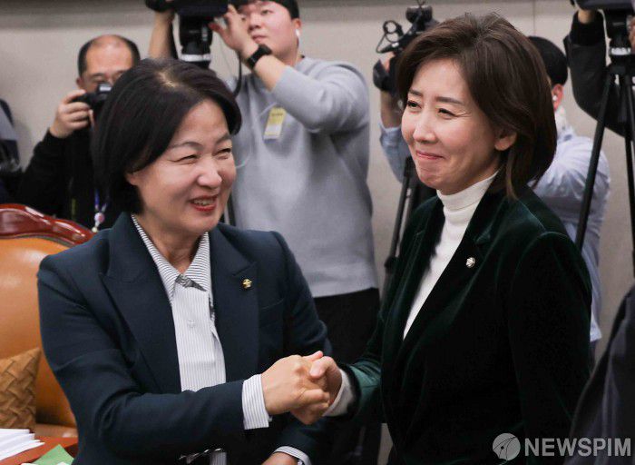 [서울=뉴스핌] 윤창빈 기자 = 추미애 국회 법제사법위원장, 나경원 국민의힘 의원이 7일 서울 여의도 국회에서 열린 법제사법위원회 전체회의에서 새해 인사를 나누며 악수하고 있다. 2026.01.07 pangbin@newspim.com |
