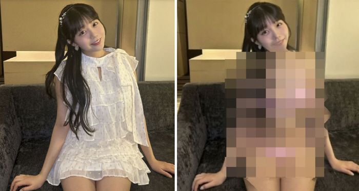 아이돌 그룹 'STU48' 멤버 쿠도 리코의 원본 사진(왼쪽)과 합성 사진.사진출처=X |