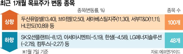 국내 증시의 강세 흐름 속에 상장사 주가에 대한 증권가의 눈높이가 높아지고 있다. 특히 반도체와 전자장비 업종을 중심으로 지난해보다 목표주가 상향 조정 사례가 대폭 늘어났다.