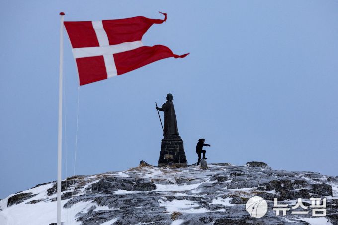 [누크=뉴스핌] 장일현 특파원 = 작년 3월 9일(현지 시간) 덴마크 자치령 그린란드 수도 누크에서 한 남성이 총선을 이틀 앞두고 덴마크 식민 지배의 상징으로 여겨지는 한스 에게데 동상 옆을 지나고 있다. 그 뒤로 덴마크 국기가 펄럭이고 있다. 2026.01.07. hjang67@newspim.com |