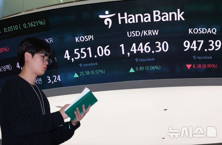 [서울=뉴시스] 배훈식 기자 = 코스피가 장중 한 때 4600선을 넘어선 7일 오후 서울 중구 하나은행 딜링룸 전광판에 코스피가 전 거래일 보다 25.58 포인트(0.57%) 오른 4551.06 포인트를 나타내고 있다. 원달러 환율은 0.80원(0.06%) 오른 1446.30원, 코스닥 지수는 8.58 포인트(0.90%) 내린 947.39 포인트. 2026.01.07. dahora83@newsis.com |