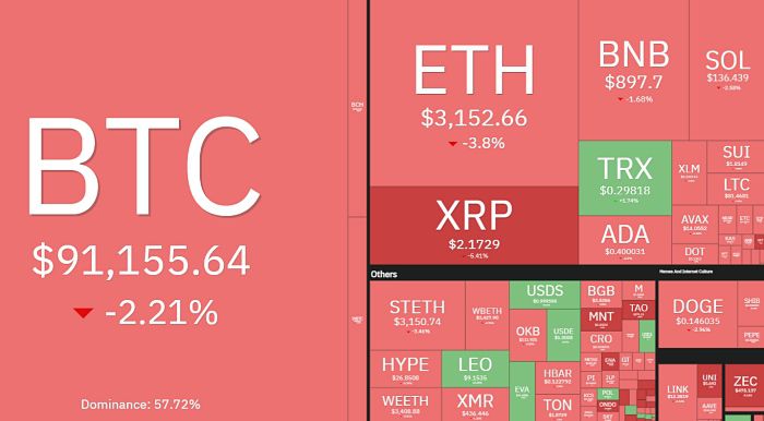 [디지털투데이 AI리포터] 암호화폐 시장이 전반적인 조정 국면에 들어선 모습이다. 8일 오전 8시 코인360을 기준으로 시가총액 1위 비트코인(BTC)은 9만1000달러 선까지 밀리며 하락세를 보였다. 비트코인은 -2%대 하락률을 기록했지만, 시장 점유율은 57%를 웃돌며 상대적인 강세는 유지했다.