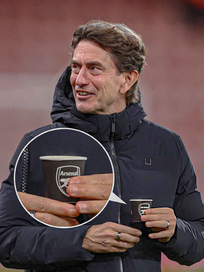 8일 본머스전을 앞두고 아스널 로고가 새겨진 컵을 들고 있는 '토트넘 감독' 토마스 프랭크. SNS |