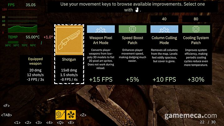 제시되는 여러 능력 중 하나를 선택하는 로그라이크 방식으로 빌드를 쌓아갈 수 있다. 플레이어는 마우스 휠을 굴려 FPS를 변동시킬 수 있으며, CPU 온도를 대가로 게임을 가속하거나 감속해 인위적인 불릿 타임을 만들어내는 것도 가능하다. 이러한 요소들은 실제 PC의 FPS나 부품 상태에 영향을 주지 않으며, 시뮬레이션을 통해 변화한다.