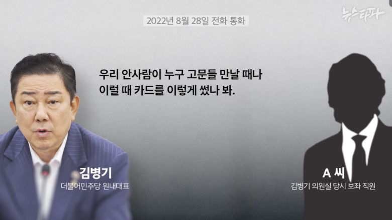 지난달 뉴스타파는 김 의원의 배우자 이 모 씨가 조진희 전 동작구의회 부의장의 업추비를 사적으로 유용한 사실을 보여주는 육성 녹음 파일을 공개했다. 지난 2022년 김 의원과 이 씨, 조 전 부의장이 김병기 의원실 보좌 직원과 나눈 통화 녹음 파일이다. 통화에서 이들은 '배우자 이 씨가 업추비를 썼다'는 사실을 전제로 이를 은폐하기 위한 대책을 논의했다. (관련 기사 아래)