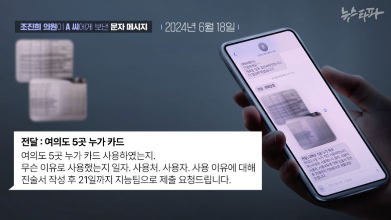 문자에는 "전달 : (2022년 7월) 서울 영등포구 여의도 5곳 누가 카드 사용했는지, 무슨 이유로 사용했는지, (사용)일자, 사용처, 사용자, 사용 이유에 대해 진술서 작성 후 21일까지 지능팀으로 제출 요청드립니다"라고 적혀 있었다. 이 문자에는 2022년 7월 12, 19, 20, 21, 22일 조 전 부의장의 업추비가 여의도 식당 5곳에서 결제된 기록도 첨부돼 있었다. 앞서 뉴스타파가 공개한 녹음 파일에서 조 전 부의장은 "배우자 이 씨가 2022년 7월 12일부터 자신의 업추비 카드를 썼고, 여의도에서 많이 썼다"고 말했다. 즉 경찰이 이 씨의 업추비 유용 날짜와 장소를 특정해 소명을 요구하자, 조 전 부의장은 A씨에게 도움을 요청한 것으로 보인다.