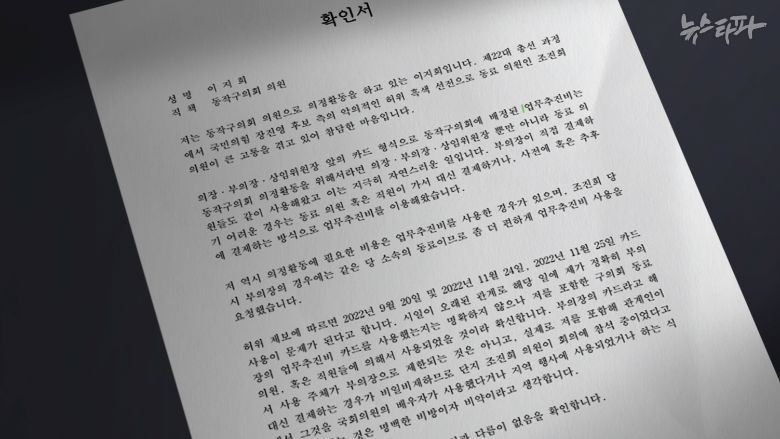 뉴스타파는 김 의원이 보좌진을 동원해 경찰에 사실과 다른 '확인서'를 제출케 한 정황도 확인했다. 뉴스타파가 입수한 이지희, 신동철 동작구의원 명의 확인서를 통해서다. 두 구의원은 모두 김 의원 지역구인 서울 동작갑 소속으로 2024년 5월경 각각 동작서에 확인서를 제출했다.