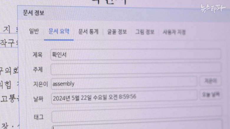 문서 정보상 파일을 최초 생성한 사람, 즉 '작성자(지은이)'는 'assembly'(국회)라는 계정으로 나타났다. 파일을 최종 수정해 저장한 사람을 뜻하는 '마지막 저장한 사람'도 assembly로 표시됐다. 이로써 파일의 최초 생성부터 마지막 수정까지 모두 assembly 계정을 통해 이뤄졌다는 사실을 알 수 있다.