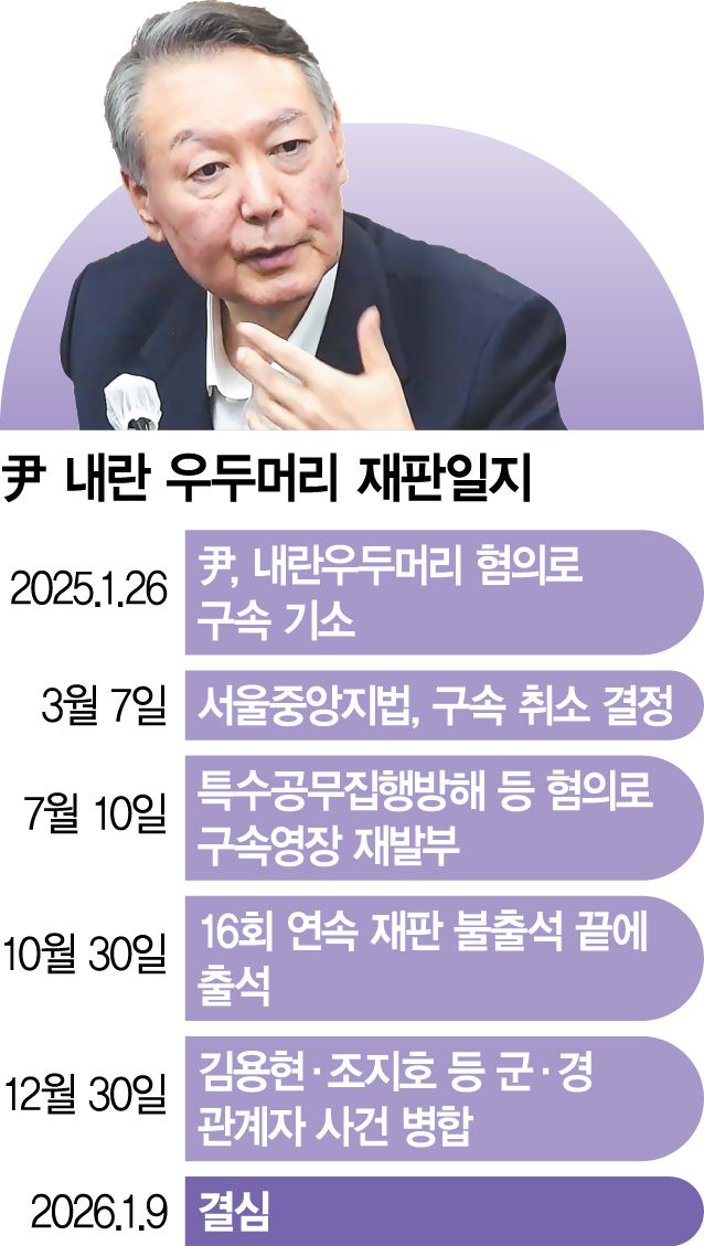 8일 법조계에 따르면 서울중앙지법 형사합의25부(재판장 지귀연)는 9일 오전 9시 20분부터 내란 우두머리 및 직권남용권리행사방해 등 혐의로 재판에 넘겨진 윤 전 대통령과 김용현 전 국방부 장관, 조지호 전 경찰청장 등 8명에 대한 결심 공판을 연다. 이는 검찰이 지난해 1월 26일 윤 전 대통령을 구속 기소한 지 348일 만이다. 결심 공판은 내란 특검의 최종 의견 진술과 구형, 피고인 측 변론·최후진술 등의 절차로 진행된다. 선고는 법관 정기 인사 이전인 2월 초·중순께 이뤄질 가능성이 크다.
