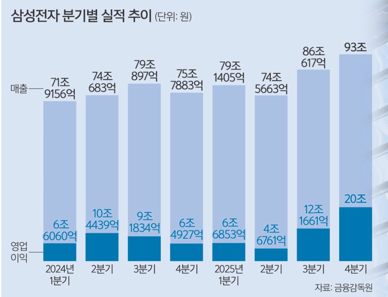 내 계좌 수익률 좀 볼까 삼성전자가 지난해 4분기 연결 기준 매출액 93조원, 영업이익 20조원으로 잠정 집계됐다고 공시한 8일 서울 서초구 삼성전자 서초사옥에서 삼성 깃발이 휘날리고 있다. 이재문 기자