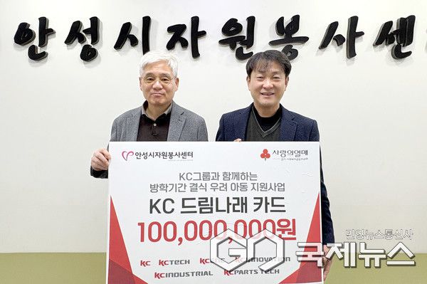 (안성=국제뉴스) 엄태수 기자 = 경기 안성시자원봉사센터는 지난 5일 KC그룹과 함께 'KC 드림나래 카드' 전달식을 열고 겨울방학 기간 중 결식이 우려되는 지역 아동들을 위한 지원에 나섰다.