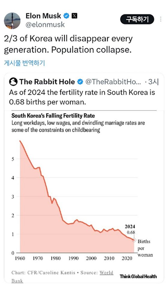 머스크가 한국의 인구 구조를 공개적으로 문제 삼은 것은 이번이 처음이 아니다. 그는 2024년 11월에도 자신의 엑스(X·옛 트위터)에 세계은행 자료를 바탕으로 한 한국 출산율 그래프를 공유하며 “한국은 세대마다 인구의 3분의 2가 사라질 것. 인구 붕괴(population collapse)”라고 적었다. 해당 그래프에는 1960년대 5명을 넘던 합계출산율이 최근 0.6명대까지 급락한 모습이 담겼다.