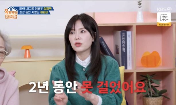 하희라는 "예전에 크게 다쳐서 2년 동안 못 걸은 적이 있다"라고 운을 떼 모두를 놀라게 했다. 그는 "촬영하다가 오토바이에서 추락해 등을 다쳤다. 그런데 겉으로 피가 나지 않아서 괜찮은 줄 알고 병원에 가지 않았다"라고 회상했다.