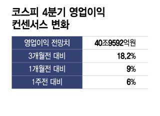 8일 에프앤가이드에 따르면 지난해 4분기 코스피 상장사(추정기관 3곳 이상인 곳)의 영업이익 전망치는 40조9592억원으로 3개월 전에 비해 18.2% 상향조정됐다. 1개월 전 전망치에 비해서도 9% 상향조정되는 등 꾸준히 실적 기대감이 높아진다.