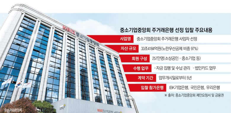 중소기업중앙회(중기중앙회) 주거래은행 자리를 둘러싼 은행권의 ‘쩐의 전쟁’이 본격화됐다. 수십 년간 관행처럼 이어져 온 IBK기업은행의 독점 구도가 깨지고 사상 처음으로 공식 경쟁입찰이 도입되면서다.