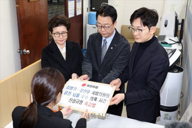 국민의힘 곽규택 원내수석대변인과 원내부대표단이 7일 오전 서울 여의도 국회 의안과에서 ‘김병기·강선우 국회의원의 공천 뇌물 수수 의혹 사건 진상규명 특검법’을 제출하고 있다. 안주영 전문기자 |