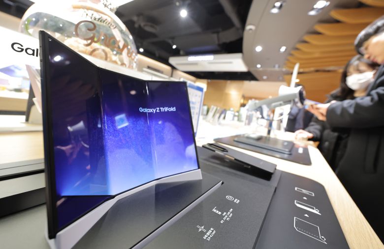 삼성전자가 두 번 접는 스마트폰 '갤럭시 Z 트라이폴드'의 3차 판매를 진행한 6일 서울 중구 삼성스토어 롯데 본점에 체험 상품이 전시돼있다./연합뉴스 |