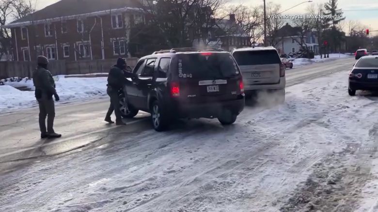 미국 이민세관국 요원들이 SUV 차량으로 다가가 하차를 요구하자 차량은 오른쪽으로 방향을 틀어 도로를 빠져나가려 합니다.