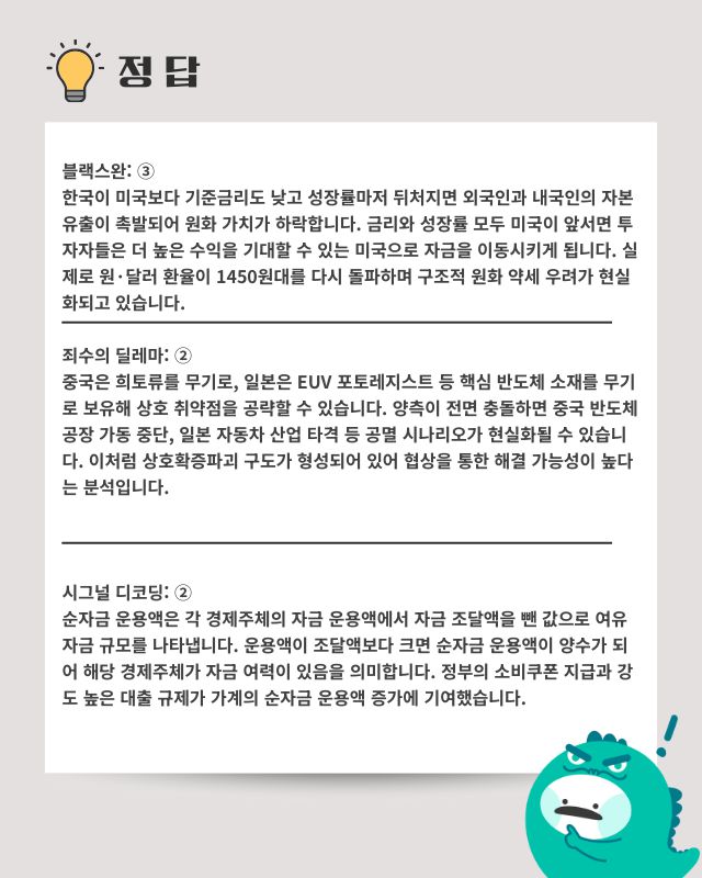 - 핵심 요약: 글로벌 IB들은 올해 미국 성장률을 2.3%, 한국을 2%로 전망해 4년 연속 역전 현상이 지속될 것으로 내다봤다. 원·달러 환율은 9거래일 만에 다시 1450원대를 찍었으며 구조적 원화 약세가 고착화될 수 있다는 우려가 나온다. 한국경제인협회 조사에서 대기업 10곳 중 6곳이 올해 투자 계획이 없거나 미정이라고 답했다. 미국은 빅테크 중심 설비 투자가 순조롭지만, 한국은 내수 부진과 급격한 고령화로 노동 생산성이 감소하는 상황이다.