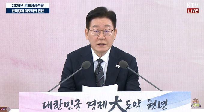 [서울=뉴스핌] 박찬제 기자 = 이재명 대통령이 9일 오후 청와대에서 열린 '2026년 경제성장전략 국민보고회' 자리에서 모두발언을 하고 있다. [사진=KTV] 2026.01.09 pcjay@newspim.com |