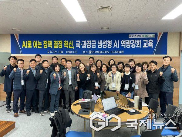 (전북=국제뉴스) 김종빈 기자 = 전북자치도는 정부의 AI 대전환 정책 기조에 발맞춰, 생성형 AI를 실제 행정업무에 바로 활용할 수 있도록 전국 최초로 도 및 공기업·출연기관 전 직원을 대상으로 하는 생성형 AI 역량강화 교육을 추진하고 있는 가운데, 2025년 우선적으로 시행한 4급 이상 국·과장급 간부공무원 대상 교육을 성공적으로 마무리했다.