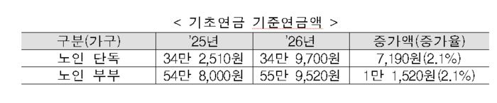 기초연금 기준연금액 역시 기초연금법에 따라 전년도 소비자물가상승률 2.1%를 반영한다. 기준연금액은 2025년 34만2510원에서 2026년 34만9700원으로 늘어난다. 올해 기초연금을 받는 약 779만 명의 어르신은 1월부터 인상된 기초연금액을 지급받는다. 복지부는 기초연금 기준연금액 인상을 위한 관련 고시를 이달 중 개정한다.