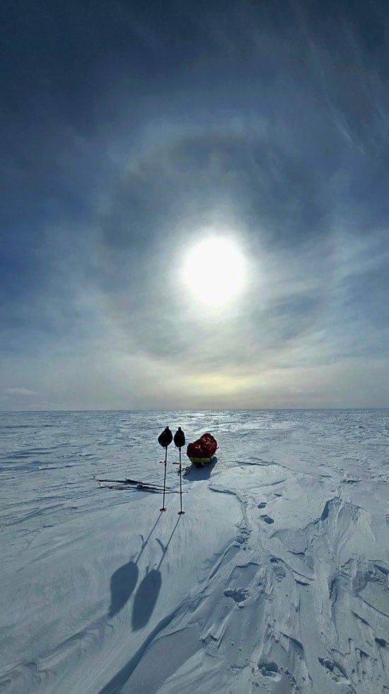 2023년 남극점까지 가는 동안엔 등 뒤로 비치던 햇무리를 본 기억이 한 번도 없다. 뒤를 돌아보면 포기하고 싶은 마음이 들까 봐 앞만 보고 걸었다. 시간에 쫓겼고 체력은 부대끼고 몸은 통증으로 울었으니 뒤를 돌아볼 여유가 없었다. 그토록 바라던 남극인데 힘들고 고통스러운 기억이 커서 남극점에 도달하고도 아쉬웠다. 이번엔 걷다가 한 번쯤 뒤돌아 햇무리를 바라볼 여유를 꼭 챙기고 싶었다. 인생에서 이런 풍광을 다시 만날 기회가 없을 것 같았다.