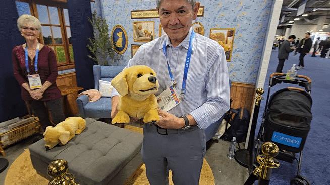 톰봇 관계자가 세계 최대 IT 전시회 ‘CES 2026’에서 선보인 리트리버를 닮은 강아지 로봇 ‘제니’를 들어보이고 있다./라스베이거스=정두용 기자 |