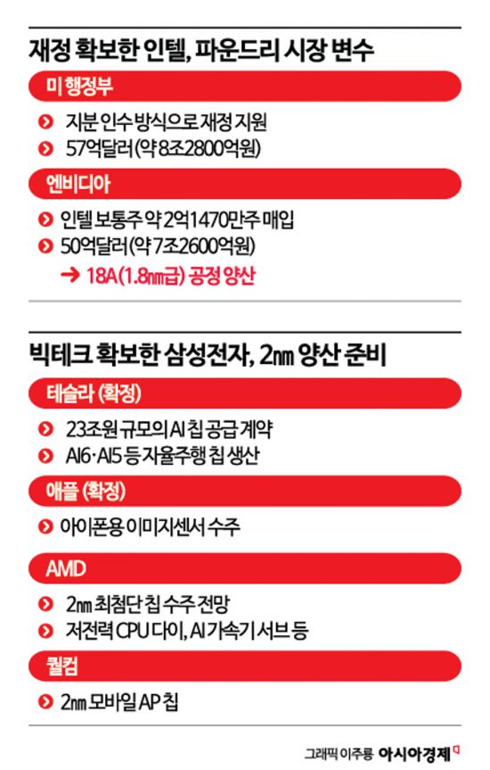 삼성전자는 시장 점유율 6.8%로 2위를 유지하고 있지만, 3위 중국 SMIC(5.1%) 등과 비교할 때 격차가 크지 않다. 인텔이 엔비디아 물량을 수주하기 시작하면 가장 위협을 받는 건 삼성전자가 될 수 있다는 우려가 나온다. 인텔은 앞서 미 행정부로부터 '지분 인수' 방식으로 지원받은 57억달러(약 8조2800억원)를 바탕으로 18A(1.8㎚급) 공정 양산을 준비하고 있다.