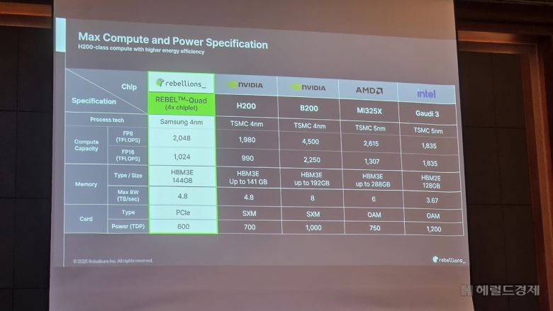 그러면서 “리벨리온의 리벨쿼드는 2PF(페타플롭스) 성능을 갖춰 국내 가속기 중에서는 가장 높은 수치를 기록했고 절대수치로만 비교하면 엔비디아의 가속기 H200급이라고 볼 수 있다”며 “엔비디아의 H200보다 전력이나 가격적인 측면에서 매력이 있다”고 말했다.