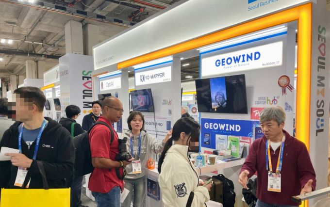 CES 2026 서울통합관에 참여한 옵트에이아이·코매퍼·지오윈드 관계자들이 방문객에게 회사를 소개하고 있다./사진=김성휘 |