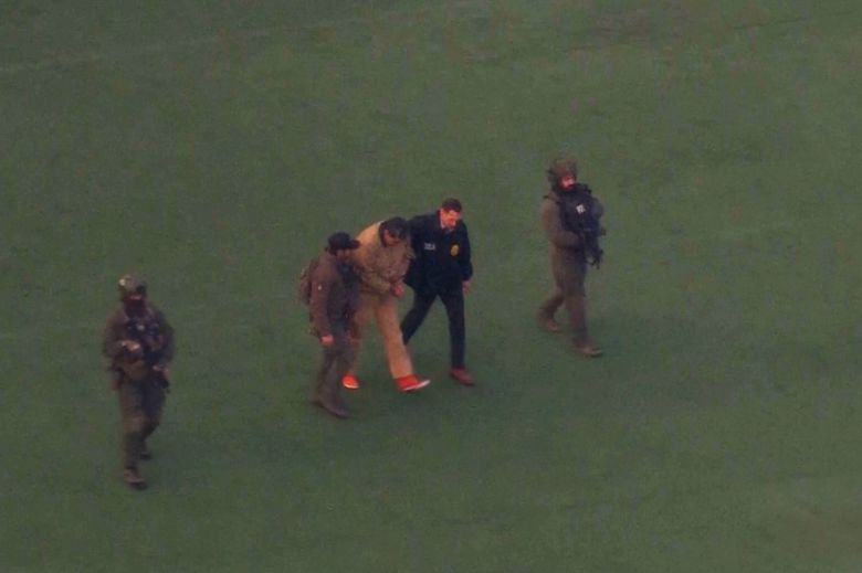 2026년 1월 5일(월) 뉴욕에서 베네수엘라의 니콜라스 마두로 대통령이 맨해튼 연방지방법원으로 이송되기 위해 헬리콥터에 오르고 있다. 방송사 헬기에서 촬영한 모습. 이 장면에서 인물은 말하지 않는다. 보여질 뿐이다. WABC 제공·AP 뉴시스) |