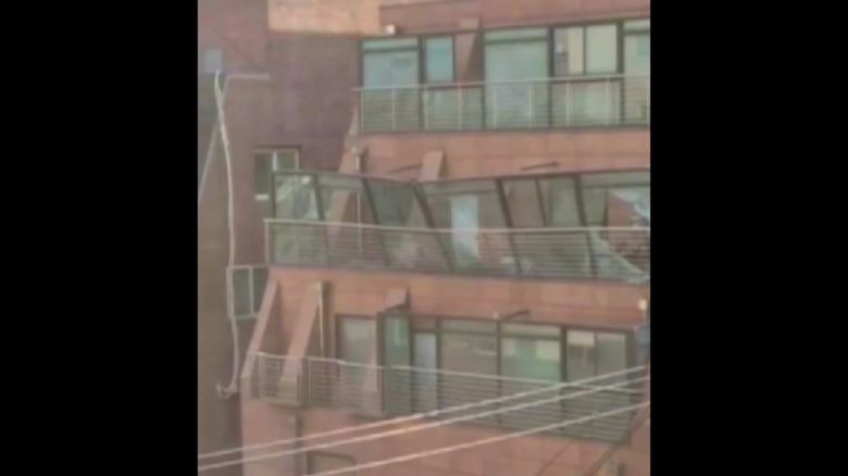 강풍으로 휘어진 구조물에 다른 유리창들도 기울어져, 곧 떨어질 것 같이 위태로운 모습입니다.