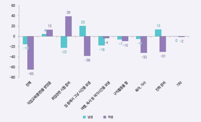 반면 여성은 ‘취업 관련 시험 준비’가 3만9000명으로 가장 많이 늘었다. 이어 ‘직업교육(훈련)을 받았음’이 1만3000명으로 뒤를 이었다. 남성의 경우 1위였던 ‘집 등에서 그냥 시간을 보냄’은 여성의 경우 3만8000명 감소했다.
