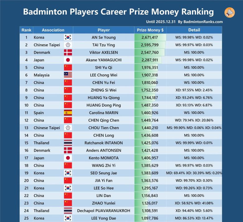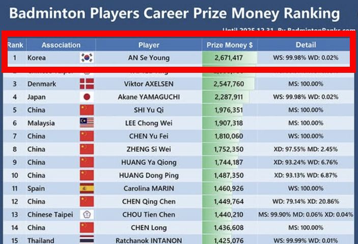 배드민턴 통계 전문 플랫폼 '배드민턴 랭크스(BadmintonRanks)'가 10일(한국시간) SNS를 통해 공개한 '배드민턴 선수 커리어 누적 상금 랭킹'에 따르면, 안세영은 2025년 12월 31일 기준 커리어 누적 상금 267만 1417달러(약 39억원)를 기록하며 전 세계 남녀 선수 통합 1위에 이름을 올렸다.