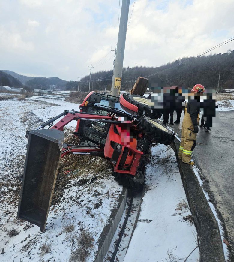 10일 오후 2시 50분께 강원 횡성군 안흥면 소사리 마을회관 인근에서 눈을 치우던 트랙터가 밭으로 넘어가면서 운전하던 주민 A(59)씨가 깔려 심정지 상태로 병원으로 이송됐다.[강원특별자치도소방본부 제공] |