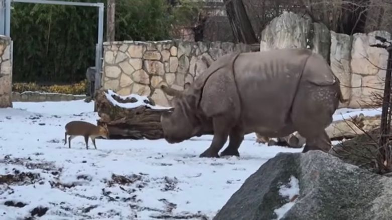 폴란드 브로츠와프 동물원 측은 9일 페이스북을 통해 13kg 사슴과 1.7톤(t) 코뿔소가 맞서는 영상을 공개했다. 영상에서 사슴은 코뿔소를 향해 거침없이 돌진했다. 이에 코뿔소는 뒷걸음질 치더니 옆으로 달려서 피했다. 사슴이 공격을 멈추지 않자 코뿔소는 결국 달아났다.