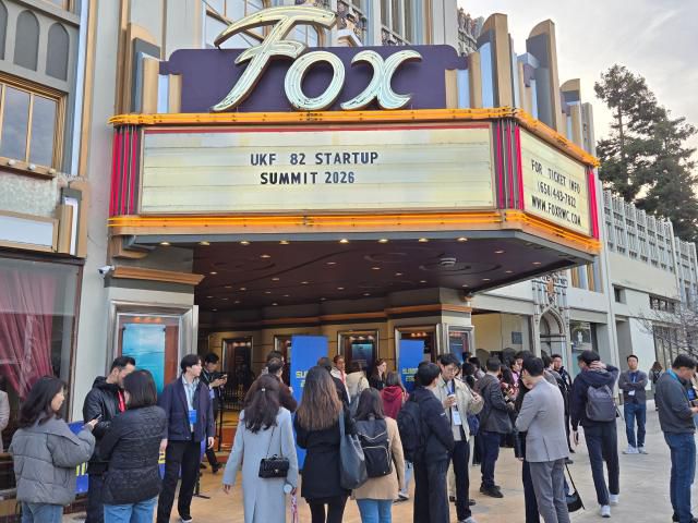 9일(현지시간) 'UKF X 82스타트업 서밋 2026'이 열리고 있는 폭스 시어터 앞에서 한국 스타트업 창업자와 VC 및 정부 관계자들이 서서 대화를 나누고 있다. [사진=아주미디어그룹 샌프란시스코 특별취재단]